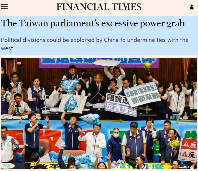 金融時報:立院職權修法 為中國對台滲透創造可乘之機 FT: Legislations passed by Taiwan Legislature Open Door for Chinese Communist Infiltration, CNA 中央社. Democracy, world history, and Taiwan Republic 台灣国 classrooms. It will take time to fully assess how much damage the thin majority the pro-communist China parties in Taiwan have done with their “reform” bills in the legislature. This Financial Times report – unless you believe the FT works on behalf of the ruling DPP – is a fair summary.